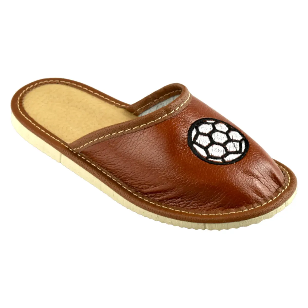Brązowe ciapcie chłopięce z piłką, pantofle dla dziecka - numer 308