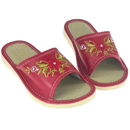 Czerwone pantofle damskie w kwiaty, wygodne kapcie damskie, papcie - numer 253