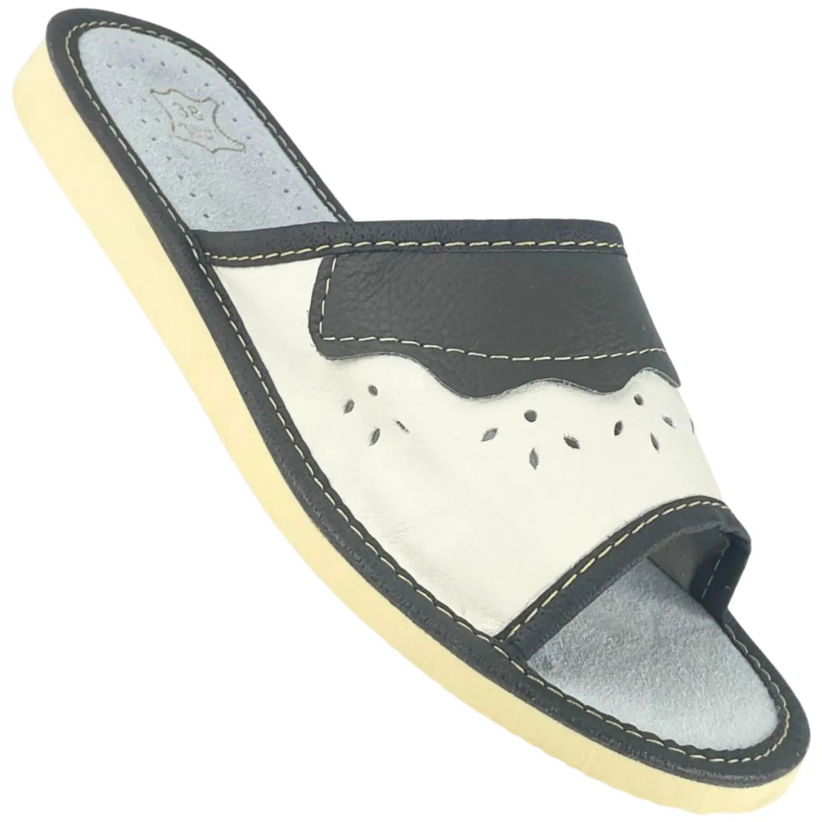 Kapcie zostały wykonane z wysokiej jakości naturalnej skóry, która zapewnia trwałość i oddychalność. Dzięki temu twoje stopy pozostaną suche i świeże, nawet po długim dniu. Miękka wkładka zapewnia dodatkowy komfort i doskonałe dopasowanie.