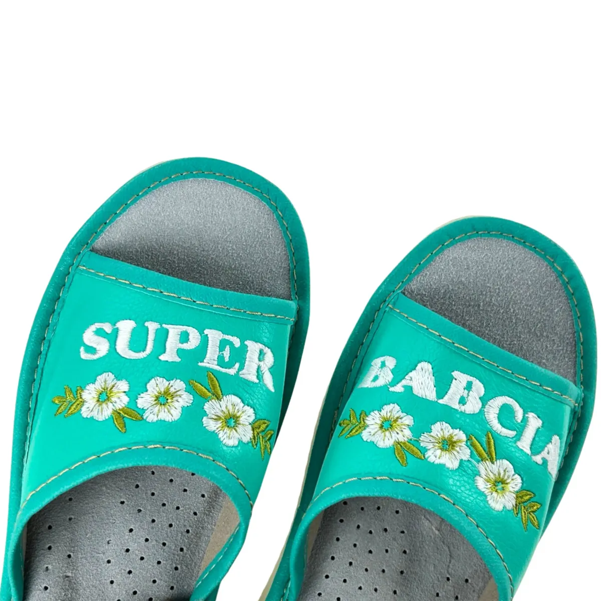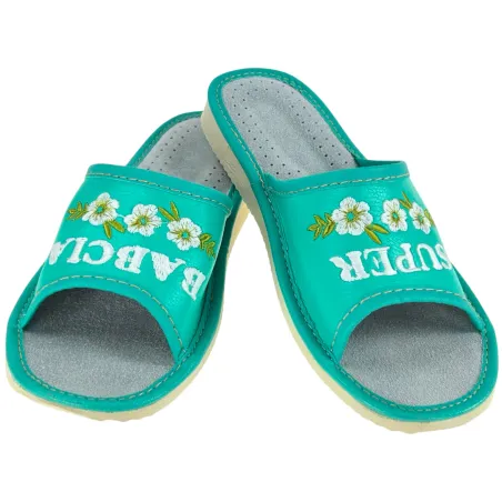 Zielonkawe kapcie z napisem super babcia Pantofle dla babci z skórzaną wkładką - numer 499