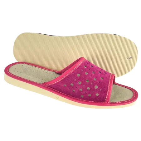 Lekkie i tanie różowe pantofle domowe, skórzane góralskie kapcie - numer 385