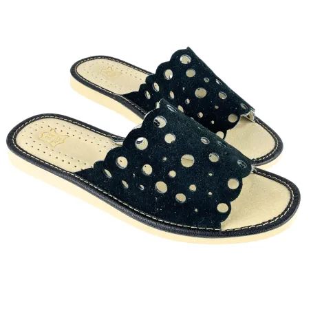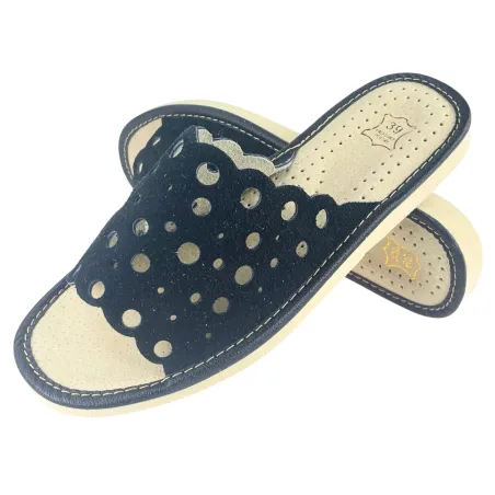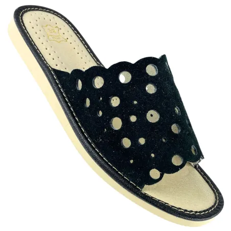Czarne pantofle domowe damskie, skórzane kapcie dla kobiet - numer 401